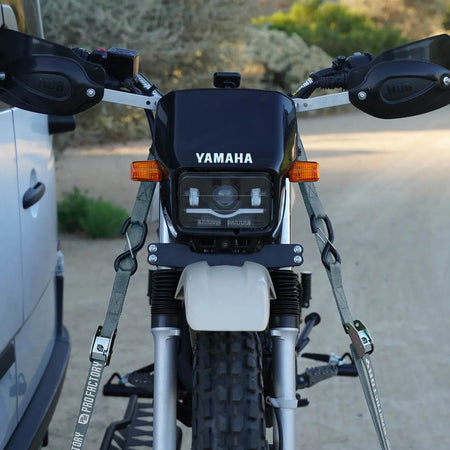Par de Sujetadores Tie Down PRO FACTORY para motocicletas, correa de 1.8 metros de largo x 25mm de ancho. Con sistema de hebilla con leva. Se coloca la correa y gancho en la moticicleta, se tira de la correa para tensar y bloquear automáticamente, ajustando la tensión según sea necesario. Para liberar, se levanta la leva de la hebilla. Es eficaz, fácil de usar y rápido para asegurar y liberar tu moticicleta. Ideal para cargar motocicletas, cuatrimotos, e-bikes en trailers, camiones. Incluye bolsa para su almacenaje.