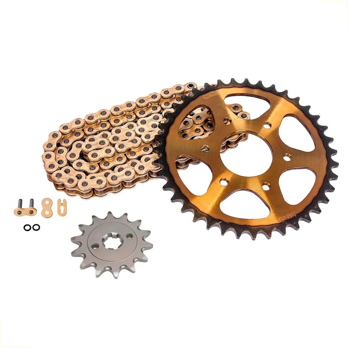Su cadena fabricada en acero de alto carbono para máxima durabilidad incluye sellos de goma llamados O-Rings que mantienen la lubricación y reducen el desgaste. Recubrimiento dorado con carburo de zinc para mayor protección anticorrosión. Resistencia y larga vida útil, apta para uso rudo.