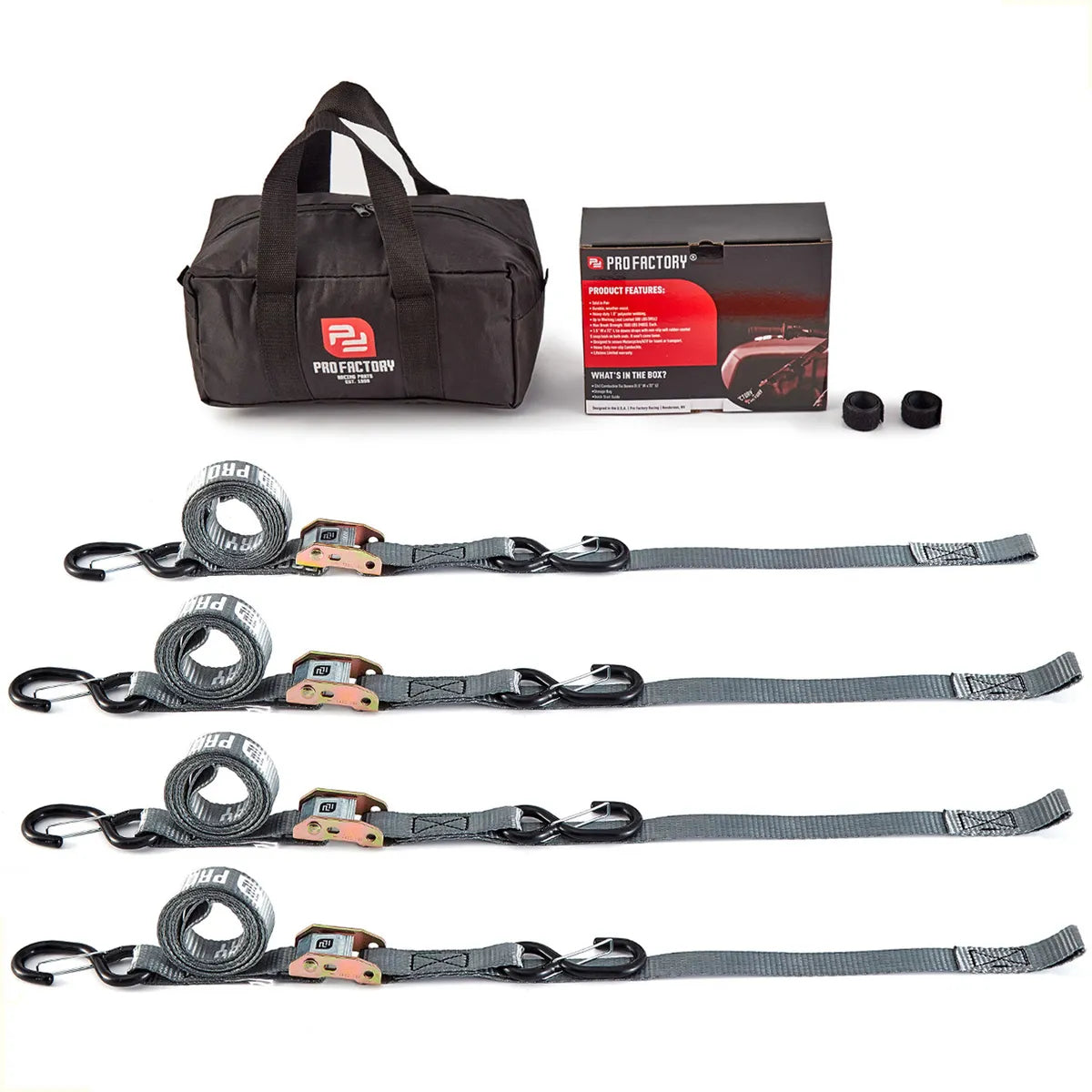 KIT X 4 CORREAS AMARRE CINCHOS TIE DOWN 1.0"/25 MM PARA MOTOCICLETAS - GRIS - PRO FACTORY