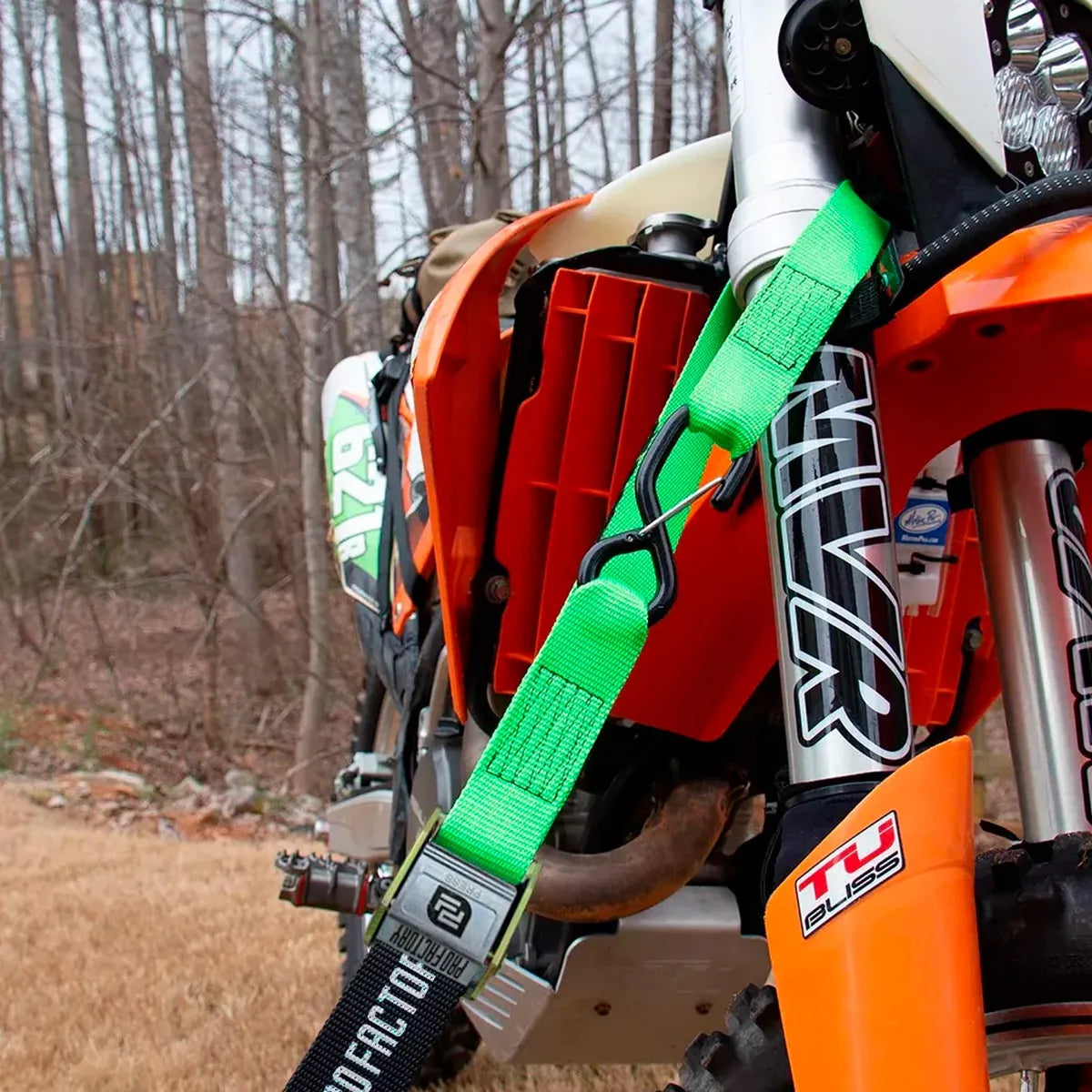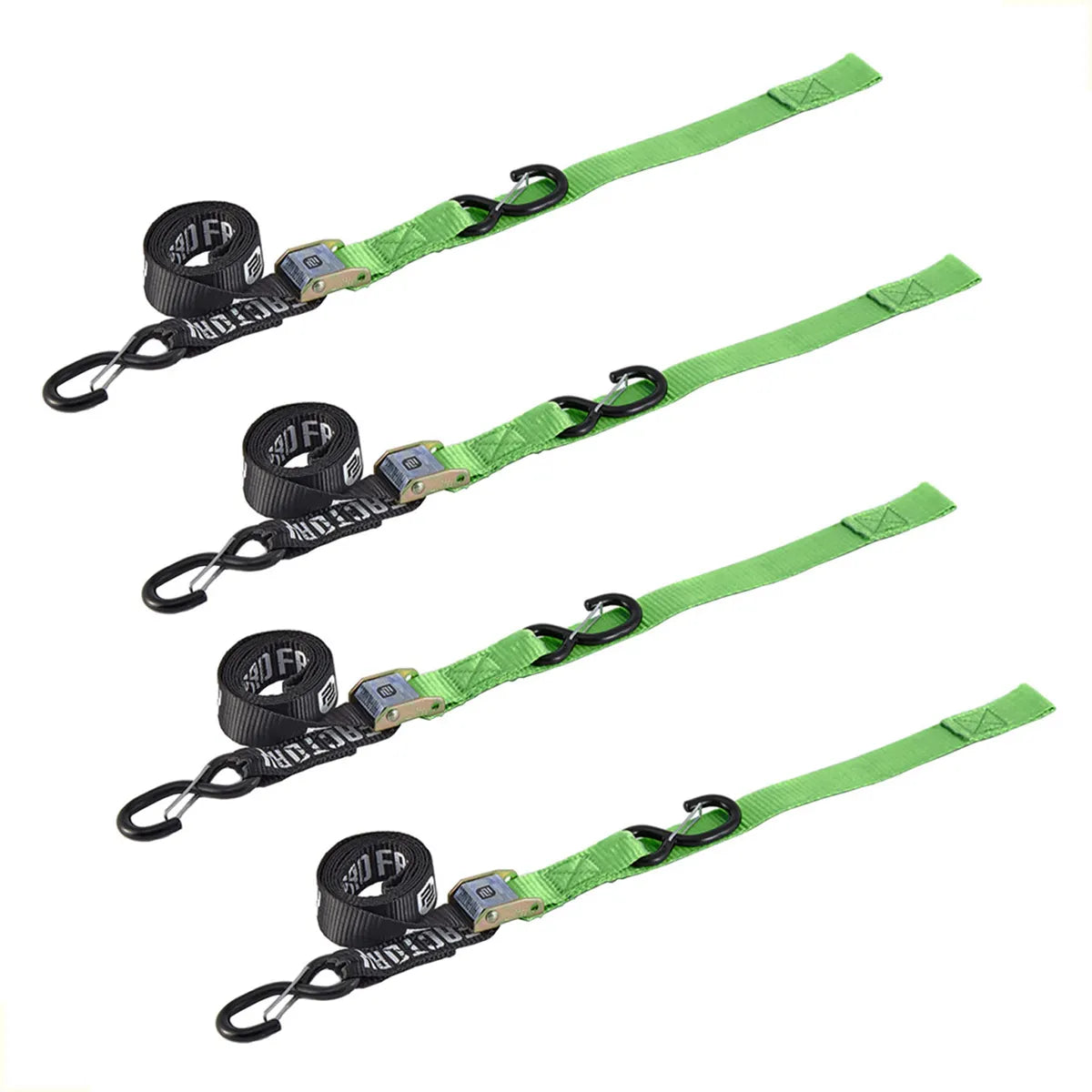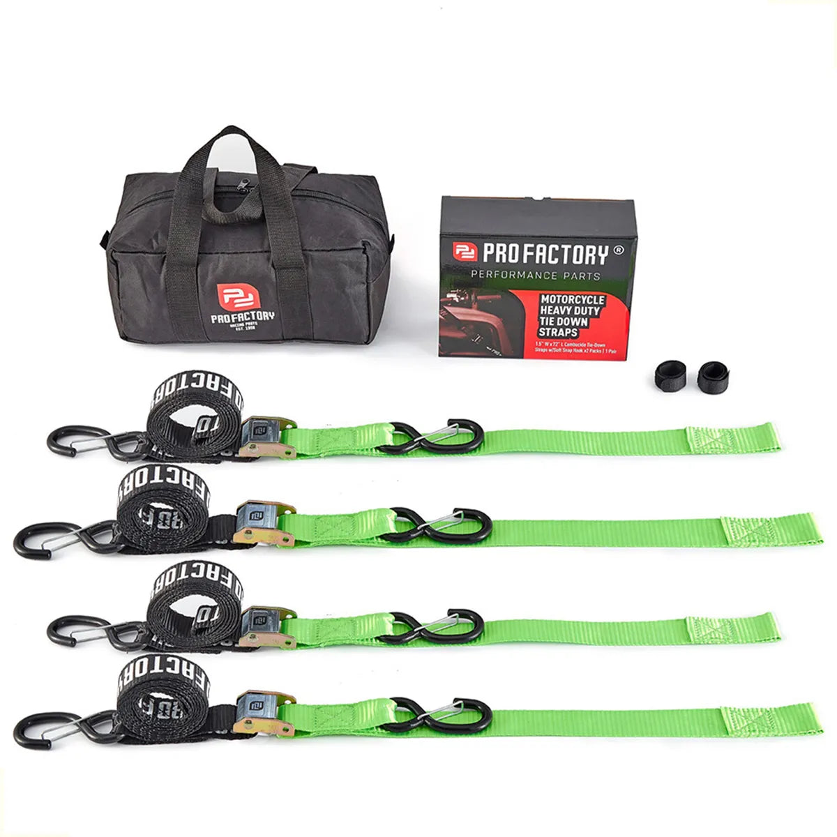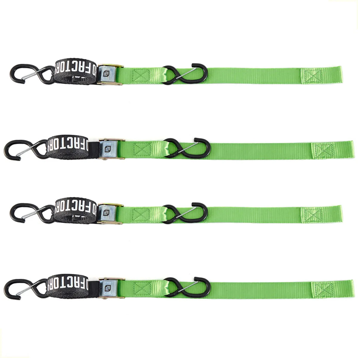 KIT X 4 CORREAS AMARRE CINCHOS TIE DOWN 1.5"/38 MM PARA MOTOCICLETAS - NEGRO/VERDE - PRO FACTORY